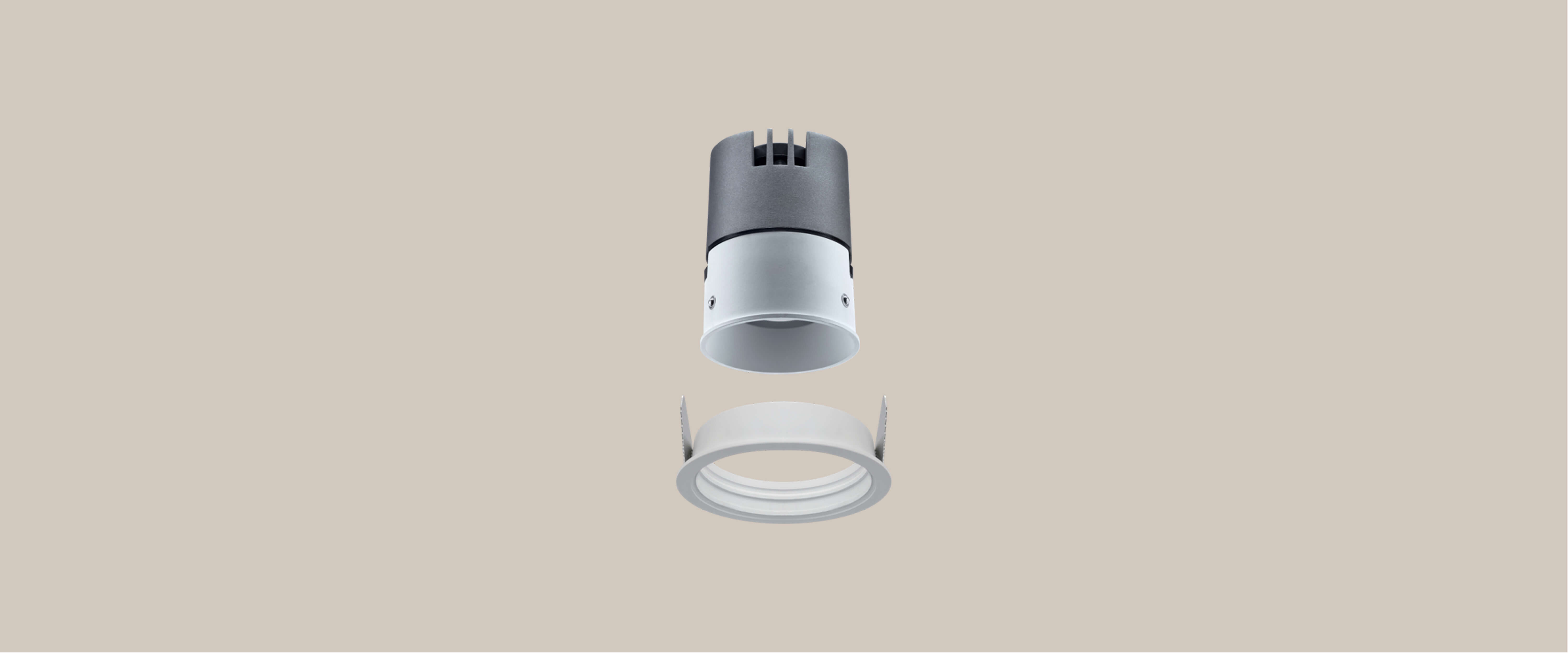 极小、极薄、极深的创新设计。玲珑灯具整体最小尺寸仅为Ø60*H72mm,因其小巧精致,故取名为玲珑。小巧的外形在安装时节省了空间开孔尺寸,有效解决了天花开孔过大,破坏空间天际线完整的问题。此外,小巧精致的灯具可与多种颜色的反射器进行有机配合,设计师/ 业主可根据天花和空间整体色彩选用不同颜色的反射器,实用与美观同在。