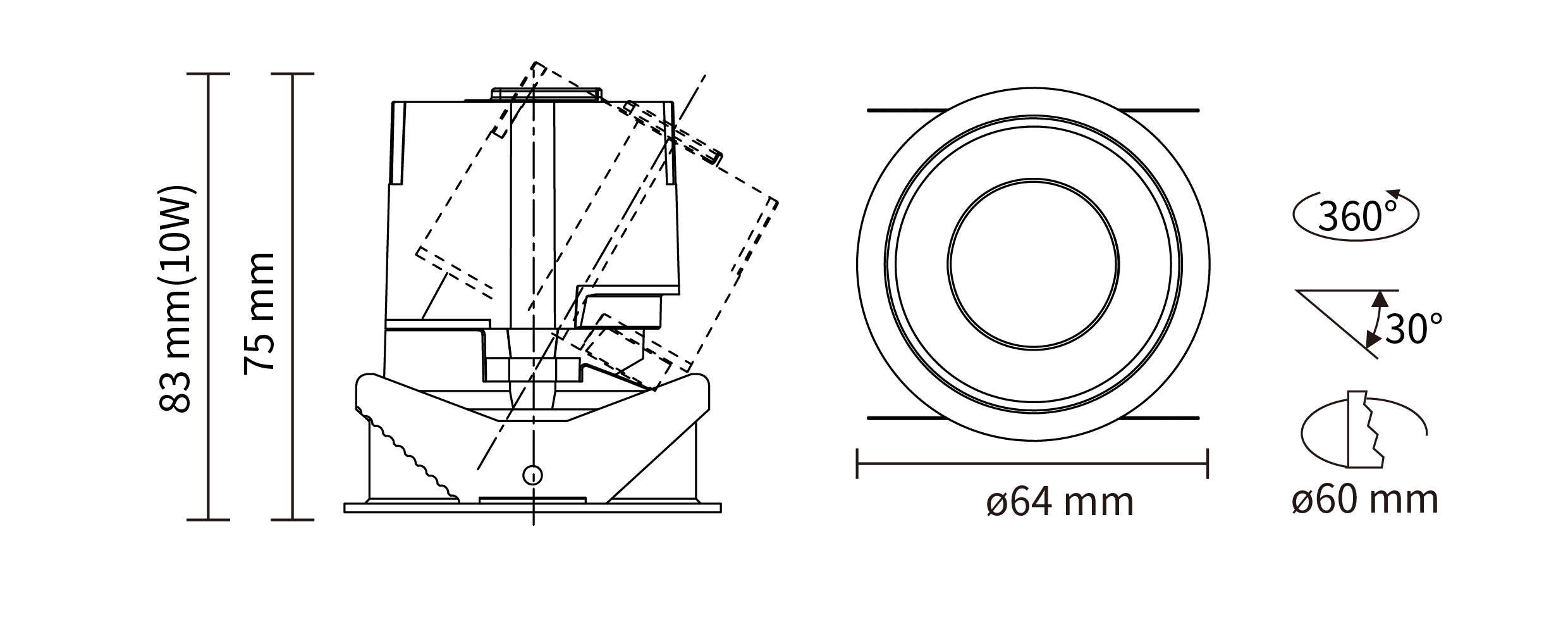 - 灯具类型:嵌入式圆形有边旋转可调角度筒灯