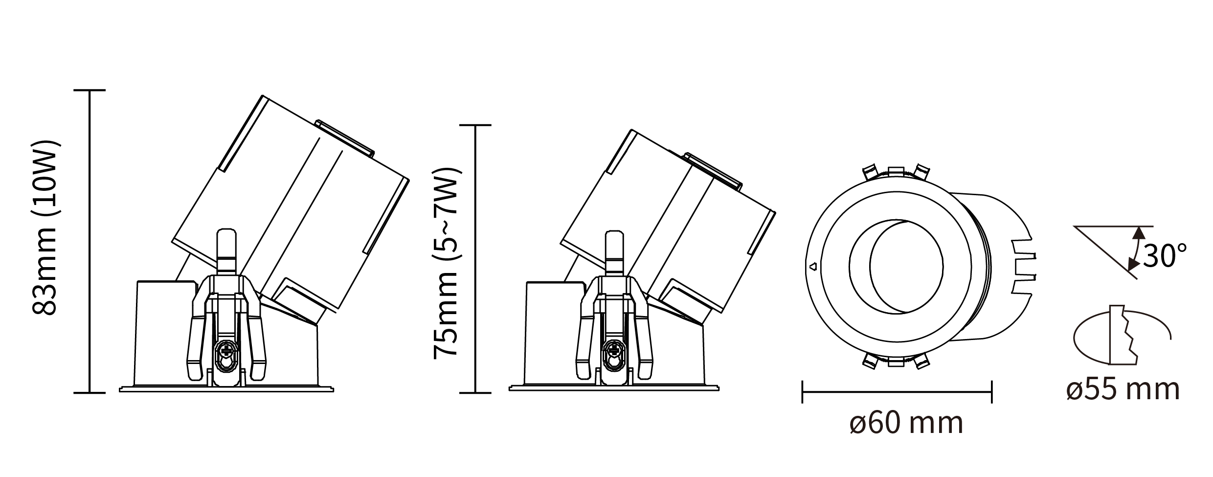 通过对可调或直射灯具的巧妙超薄设计,玲珑灯具的最低高度控制在72mm 范围内,在满足天花内空高80mm 的情况下,最大限度的节省了室内使用空间,且针对小尺寸筒灯的全新弹片设计,在满足偏光30 度的条件下,还能有效解决天花厚度8~20mm 的安装要求,设计的创新及实用性在玲珑灯具的研发和应用上表现的淋漓尽致。