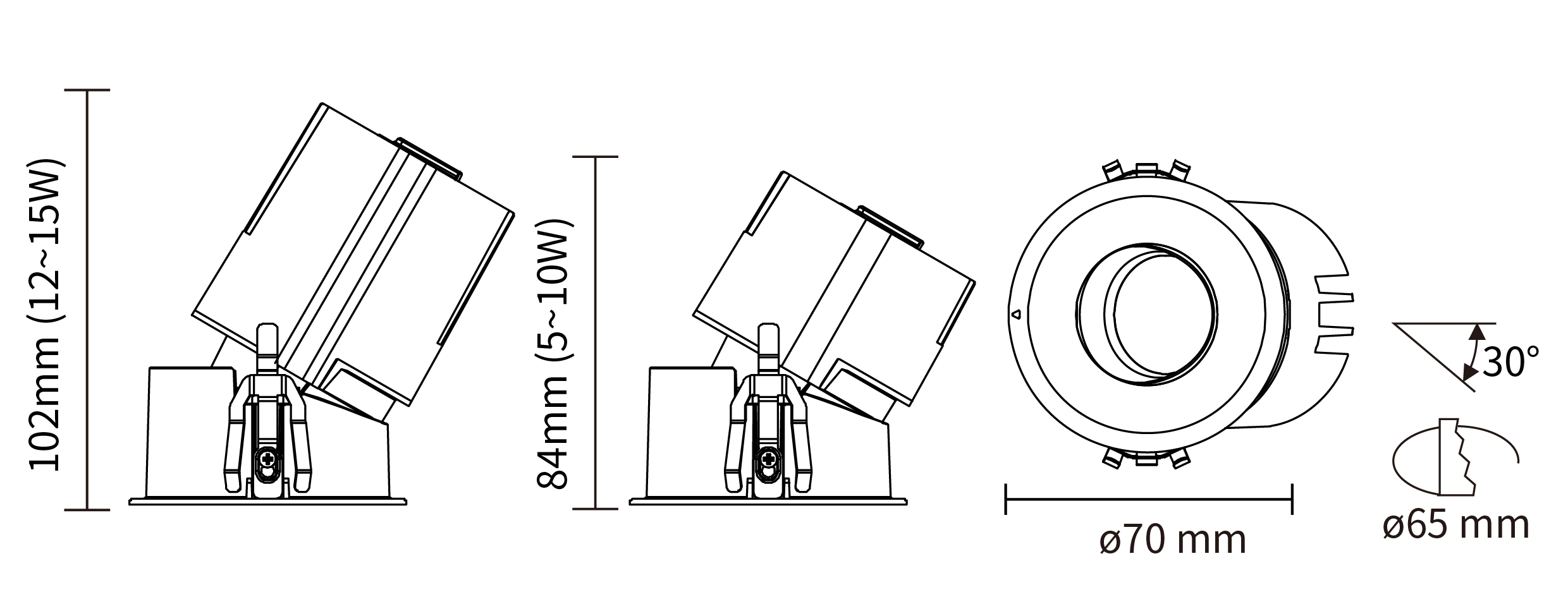 通过对可调或直射灯具的巧妙超薄设计,玲珑灯具的最低高度控制在72mm 范围内,在满足天花内空高80mm 的情况下,最大限度的节省了室内使用空间,且针对小尺寸筒灯的全新弹片设计,在满足偏光30 度的条件下,还能有效解决天花厚度8~20mm 的安装要求,设计的创新及实用性在玲珑灯具的研发和应用上表现的淋漓尽致。
