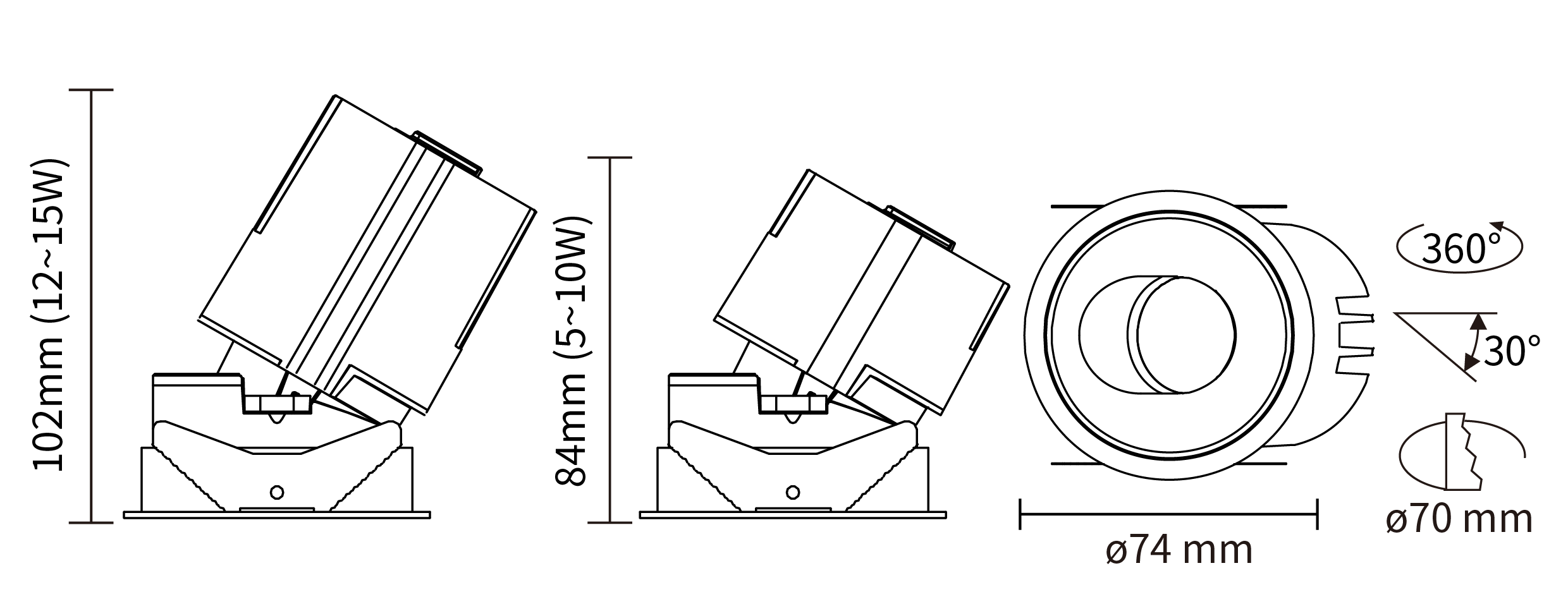 - 灯具类型:嵌入式圆形椭圆孔可调角筒灯