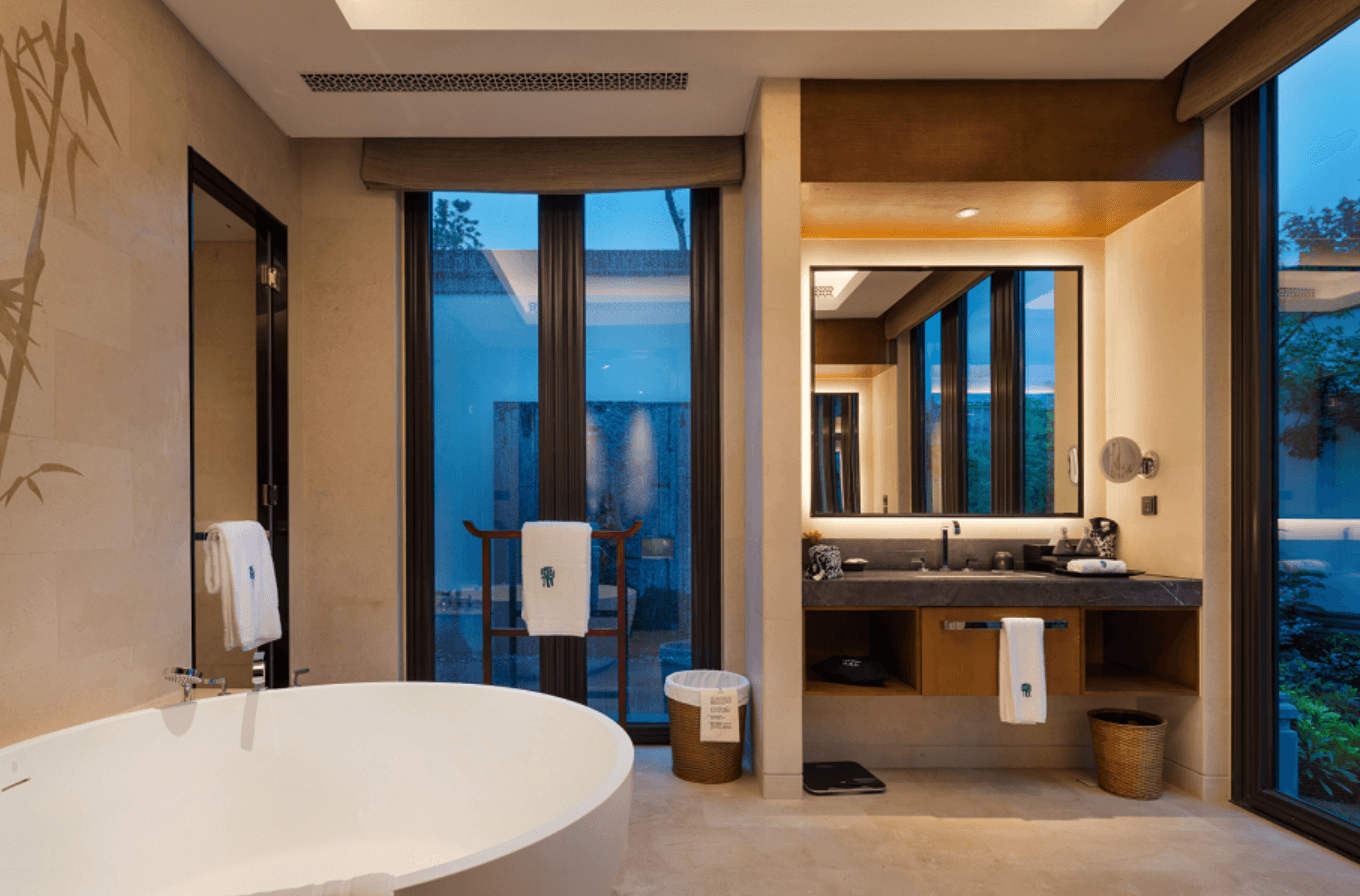 酒店设有121间宽敞的客房与套房以及30栋别墅,落地窗朝院中,被青砖包裹着,竹林掩盖,低色温的暖黄光,让人很容易被内部透露出的温暖所吸引。